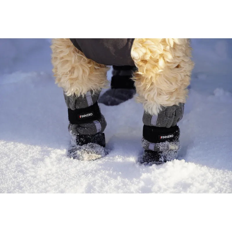 Finnero’s populära Halla Bootie har fått sig en uppdatering för att öka säkerheten för din hund. Varje sko har utrustats med en rejäl reflexremsa av hög kvalitet, för att synas ordentligt i mörkret. Hundskorna skyddar hundens tassar i snö och håller dem varma i frost och kallt väder. De är kända för goda passform och populära tack vare att det går upp en bit på benet.