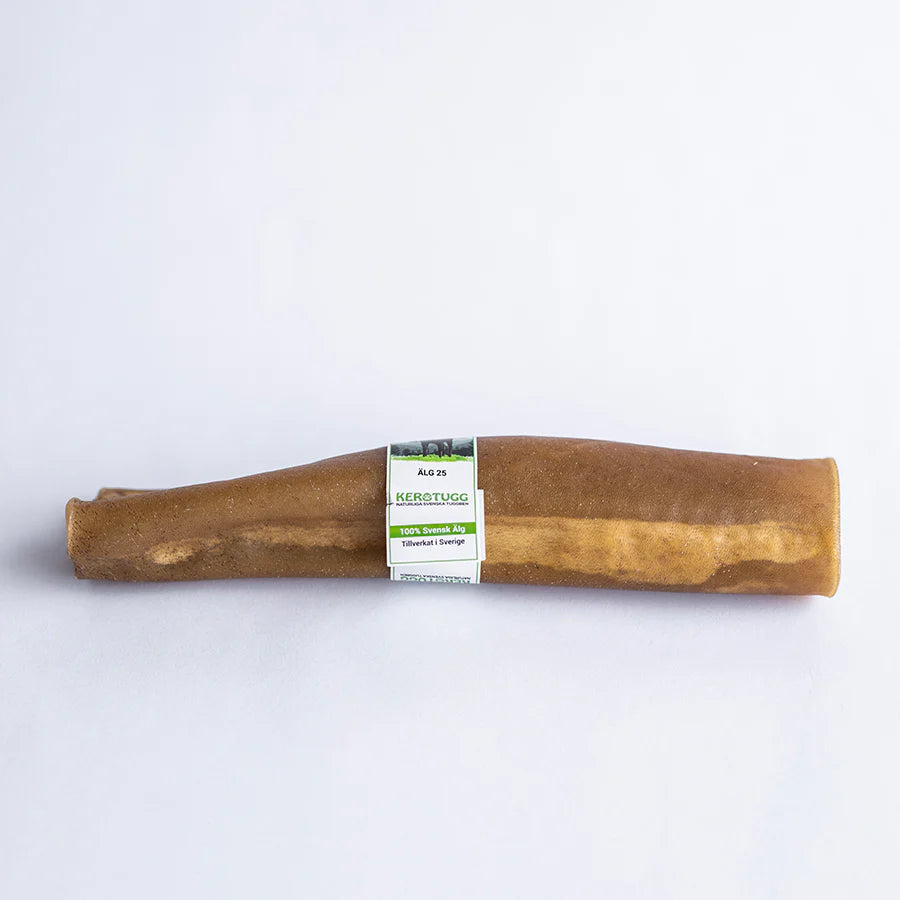 De här naturliga och hållbara tuggrullarna är gjorda av torkad råhud från älgar som vandrar i norrbottniska skogar, och är perfekta tuggben för hundar som älskar den naturliga smaken av älg. Du kan vara säker på att dina hundar inte tuggar på något som är blekt eller innehåller några som helst tillsatser, lim eller andra konstigheter. Med en längd på 25 cm och diameter på 3 x 4,5 cm är dessa tuggben passande för medelstora till stora hundar. Alla Keros tuggben är tillverkade i deras fabrik i Tornedalen!